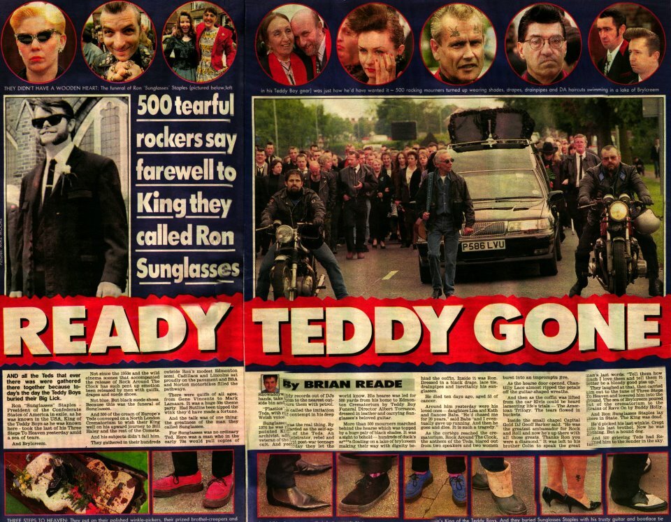 As the procession, lead by a leather clad undertaker, and including many bikes and hundreds of Teds walking behind the cars, arrived at the Crematorium, Rock Around The Clock started up with people breaking out in a jive in front of the lead car. This funeral created a long lasting memory in the minds of everyone who knew Ron. Alongside all Ron's friends and relatives were press reporters and photographers and a television crew all covering the funeral? Ron could almost have been royalty, in fact he was billed as the most famous Teddy boy in the world.